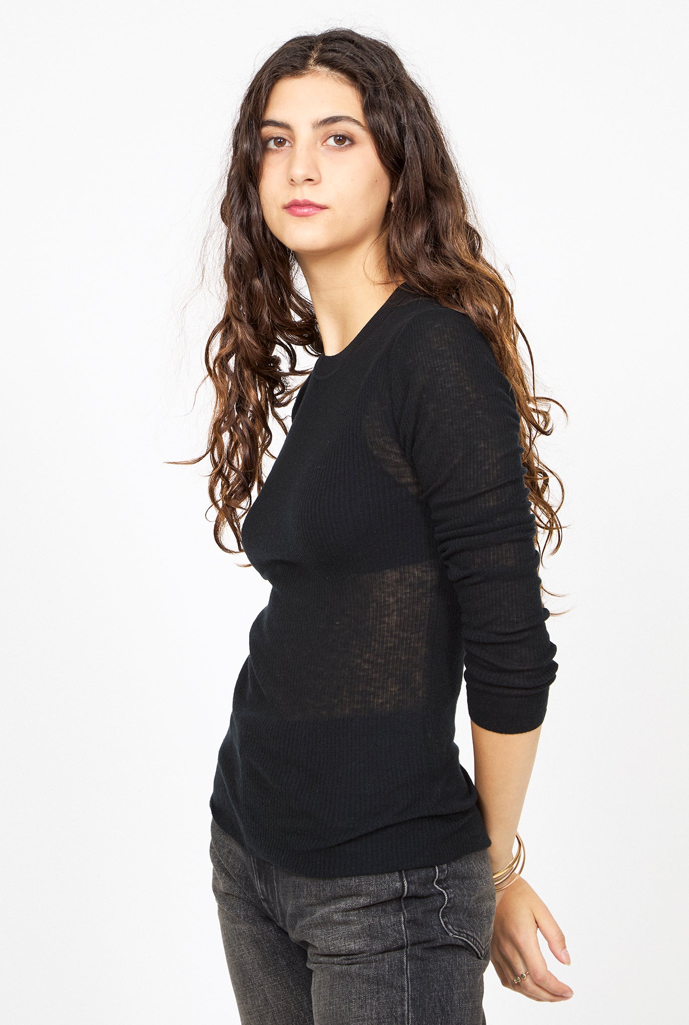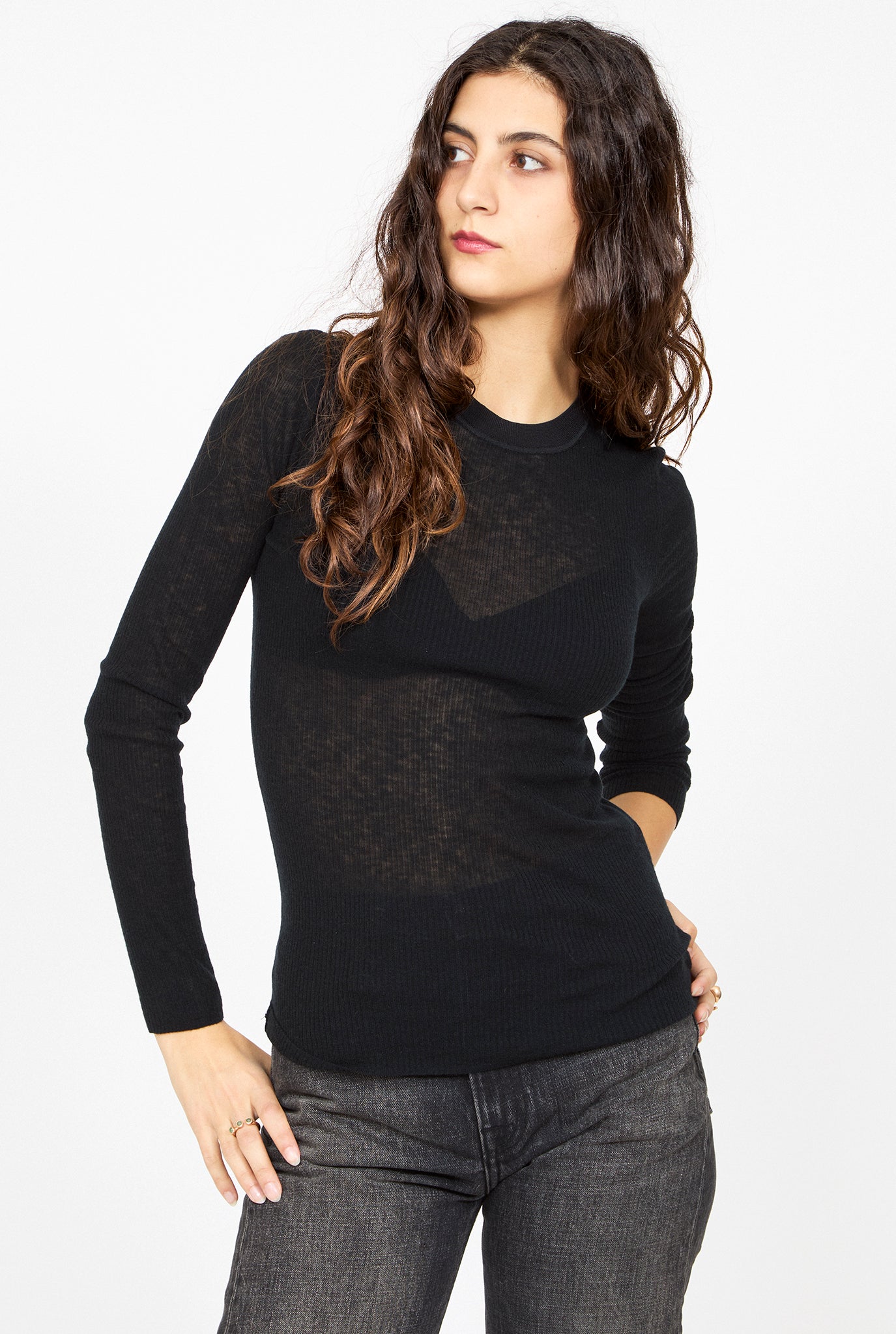 Skinny Long Sleeve Crew sweater produced in a gauzy, tissue-weight wool yarn. Contrast neckline. Ribbed with slim fitting body and long, slim sleeve. Perfect for layering. Slightly sheer. Model is 5'8" and wearing an extra small.