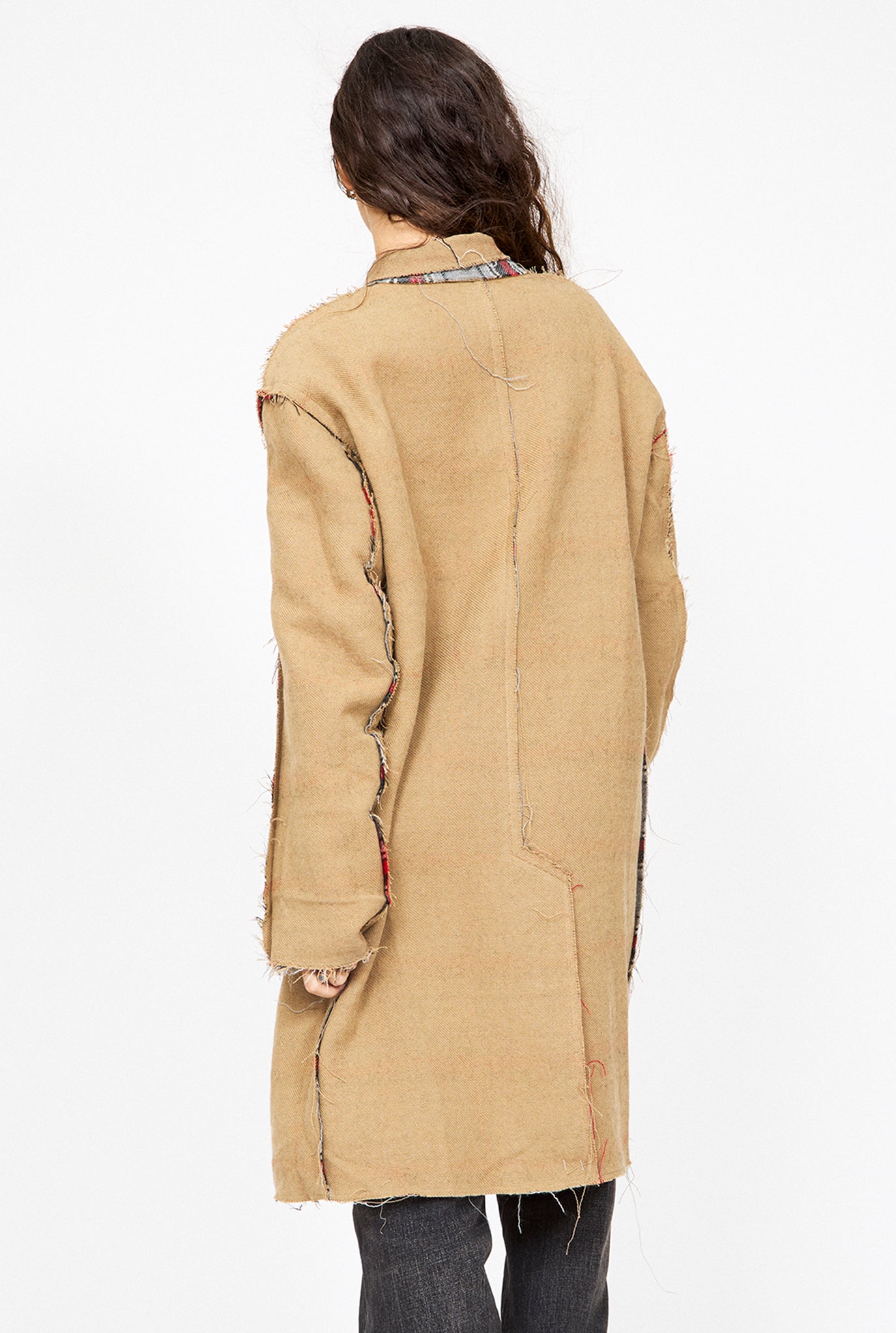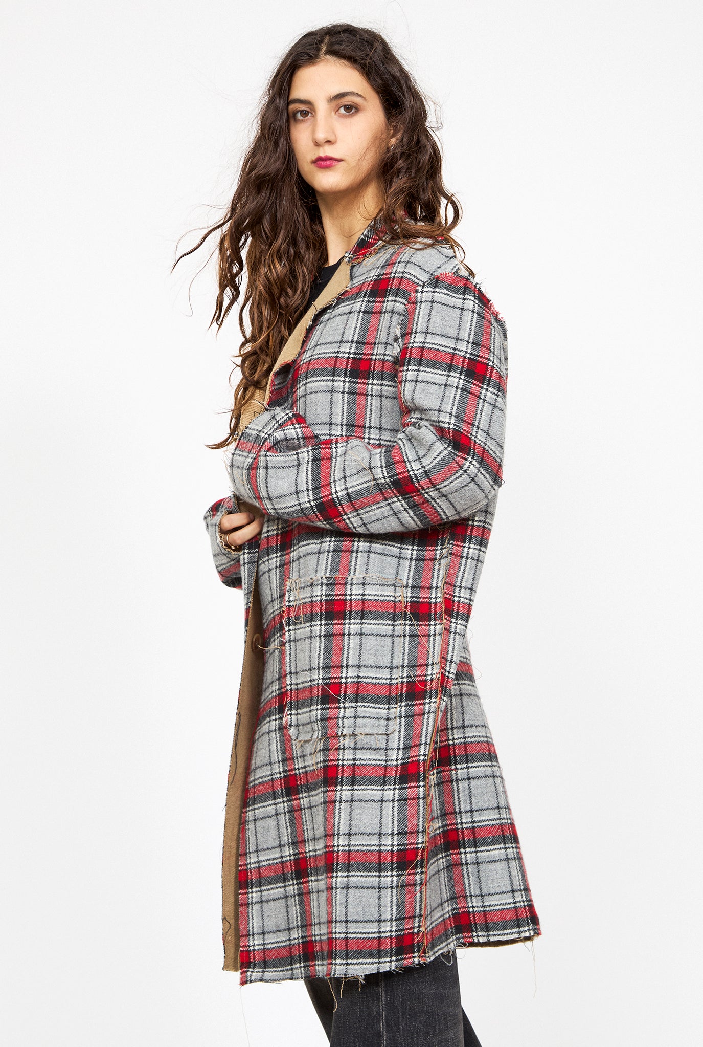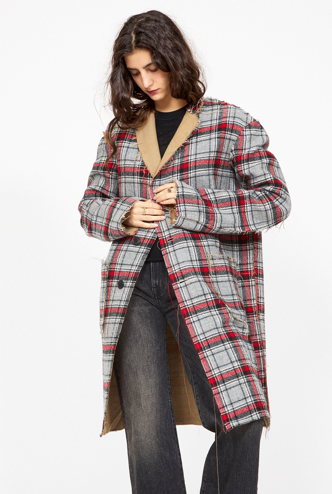 Oversized raw cut coat built from double-sided, Italian cotton-wool plaid. Model is 5'8" and wearing an extra small.