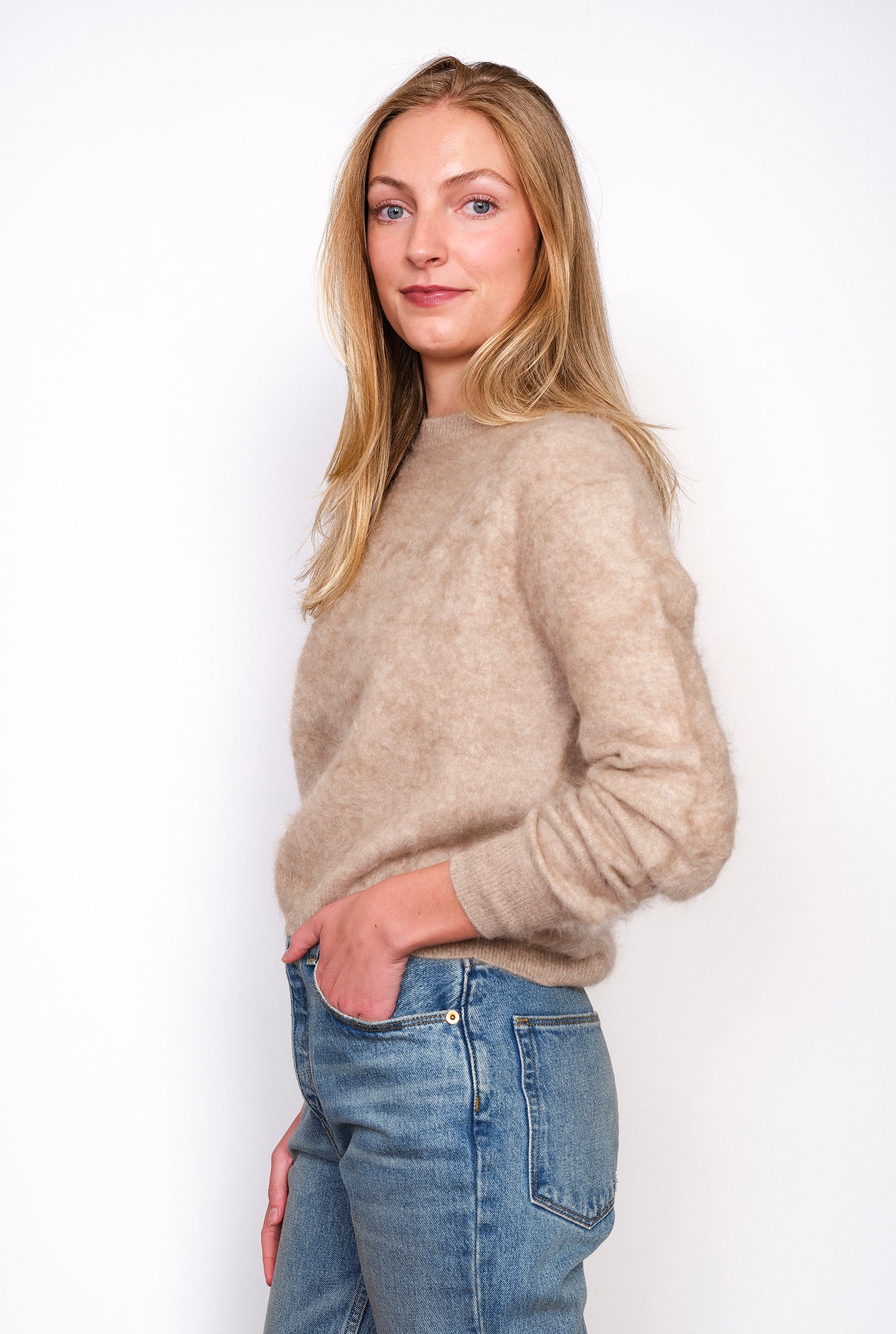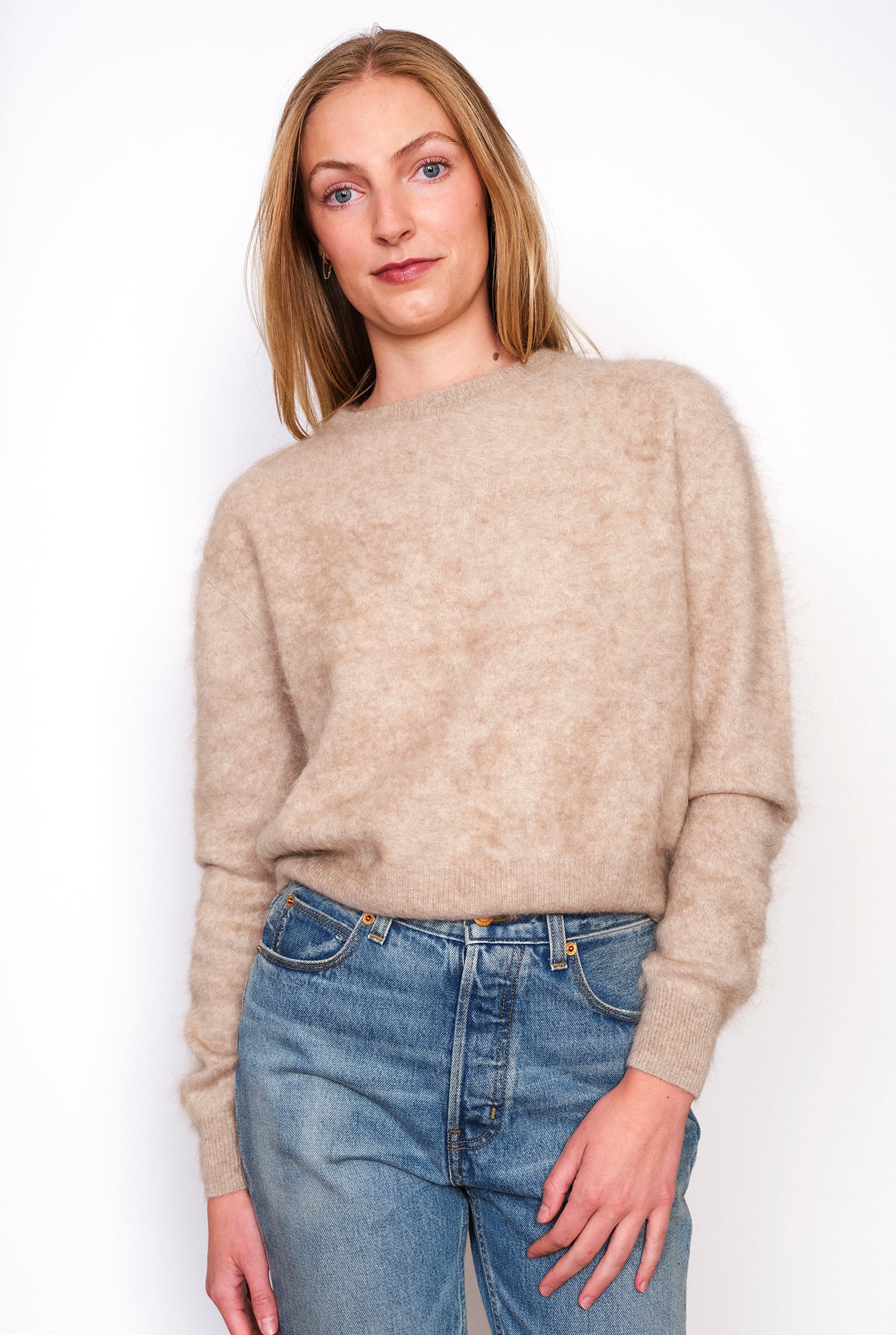 Guest in Residence Grizzly Crew. Brushed, fuzzy cashmere. Slightly cropped styling. 100% cashmere. Model is 5'4" and wearing a size X-Small.